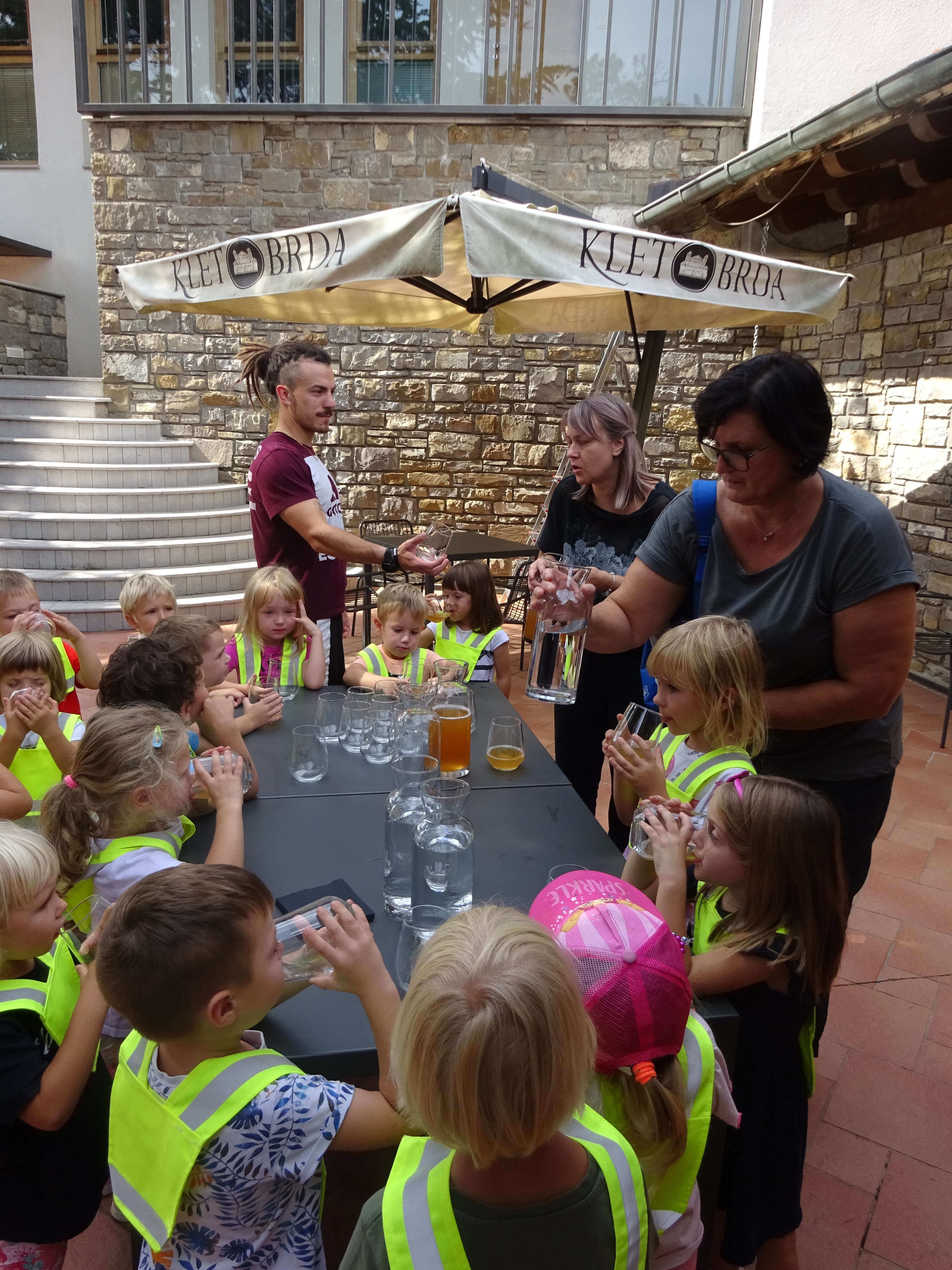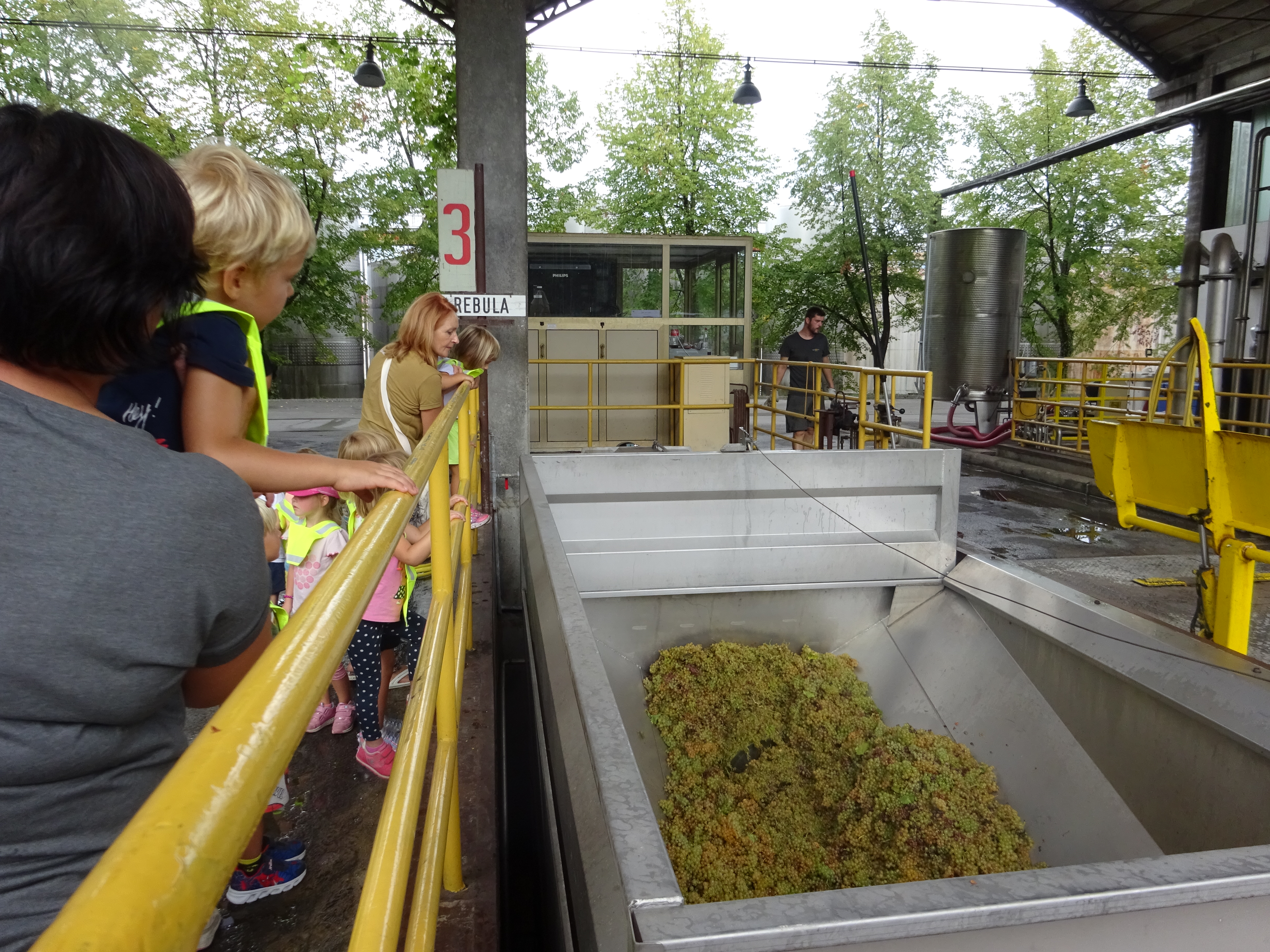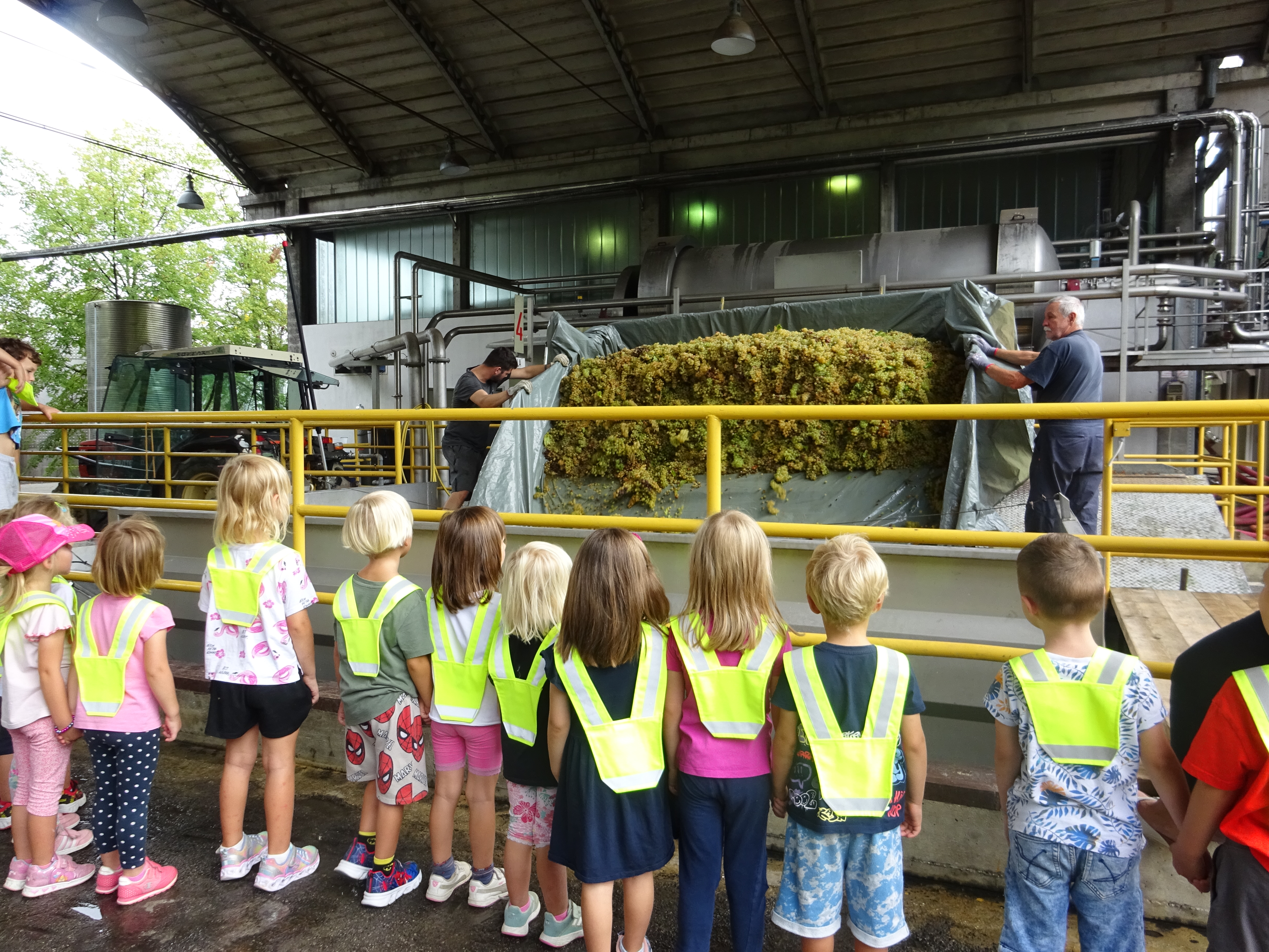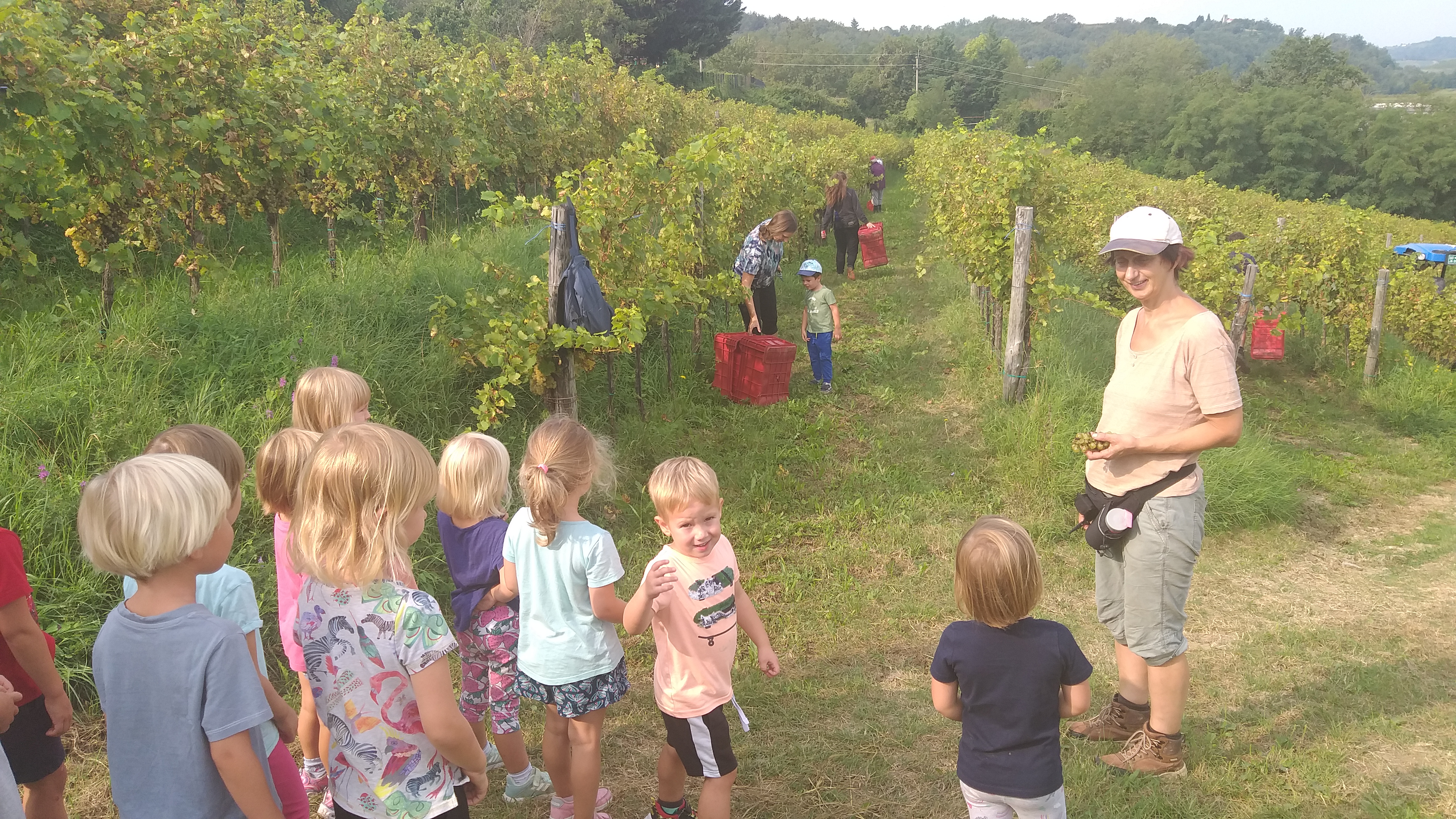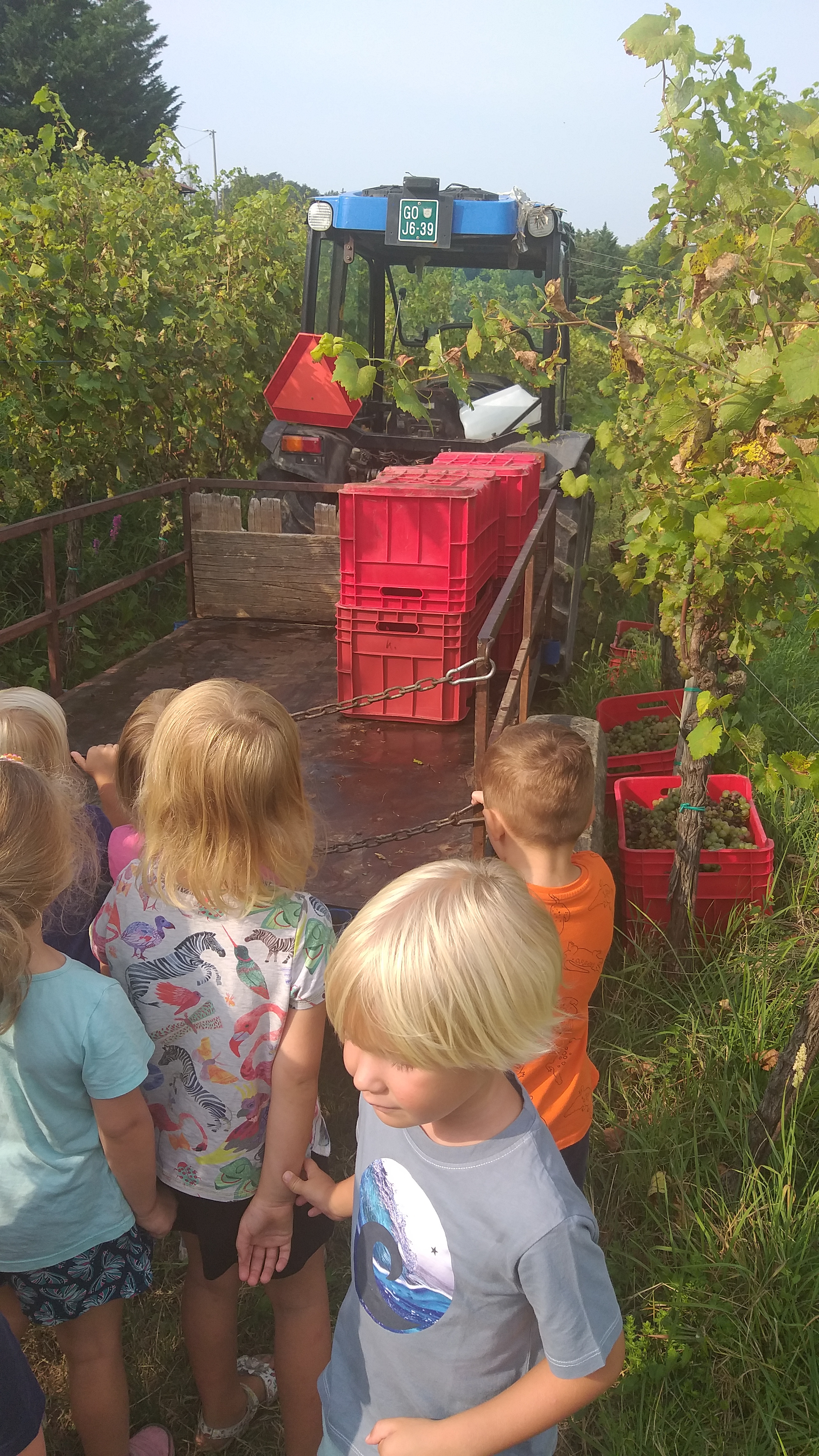 Otroci iz Modre igralnice so si v septembru ogledali trgatev v vinogradu ob neposredni bližini vrtca. Sami so nabrali nekaj grozdja, ga okušali z vsemi čutili in navdušeno spremljali trgače, kako polnijo zaboje z grozdjem in le-te nalagajo na prikolico traktorja. Sledil je ogled same poti predelave grozdja v kleti Dobrovo. Spremljali so prevzem grozdja, kako se iz prikolice grozdje napolni v mlin, zmelje, sledi stiskanje v stiskalnici in polnjenje grozdnega soka v cisterne, kjer kasneje dozori v vino. Grozdni sok so otroci z veseljem okušali in bili nad njim zelo navdušeni.