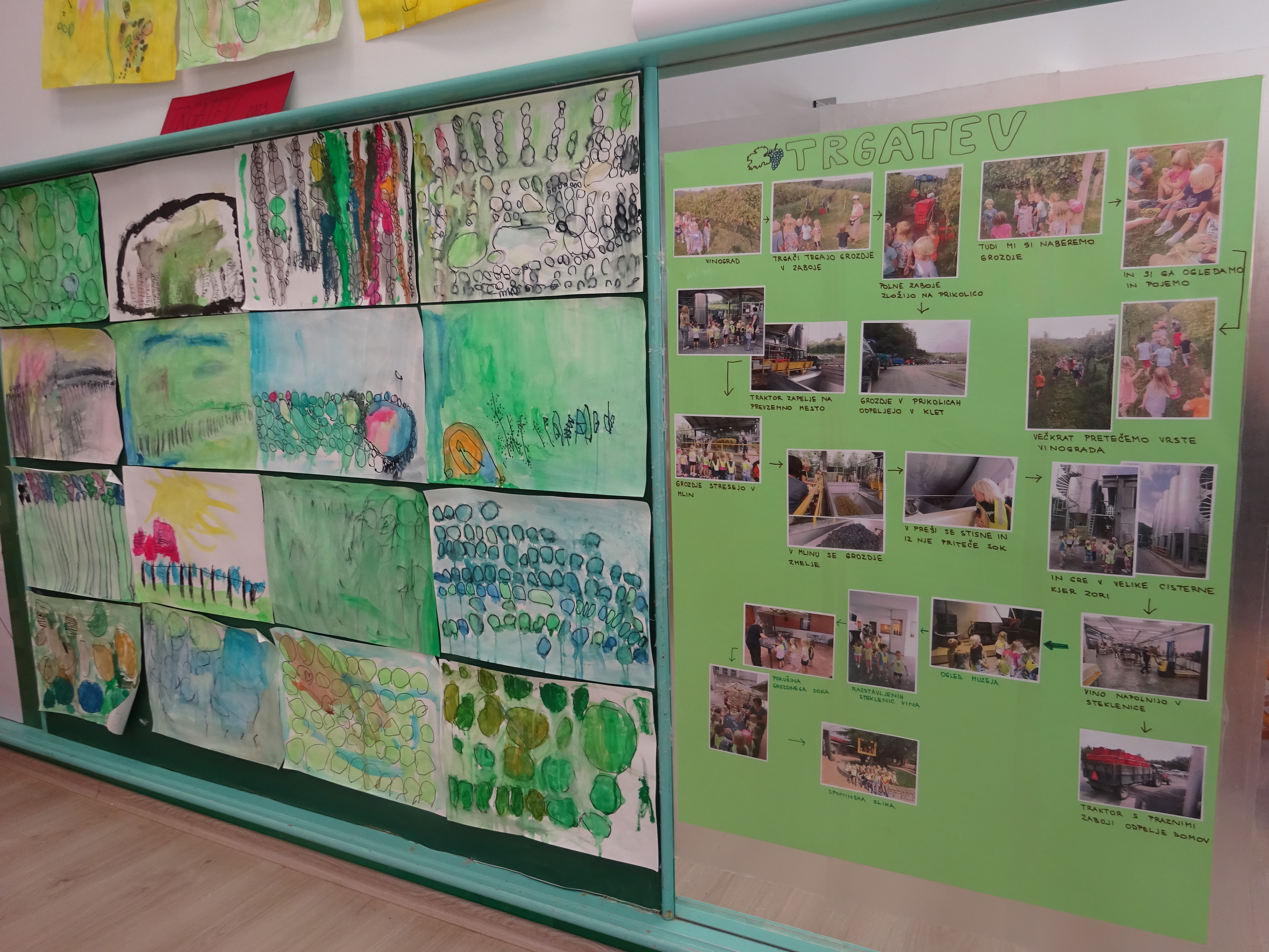 V igralnici so svoje doživetje v vinogradu podoživljali ob slikanju z akvarelnimi barvami, slike pa smo razstavili. Ob pogovoru v jutranjem krogu smo naredili tudi plakat z dejavnostmi na dan trgatve in predelave grozdja, ki si ga vedno znova radi ogledujemo.