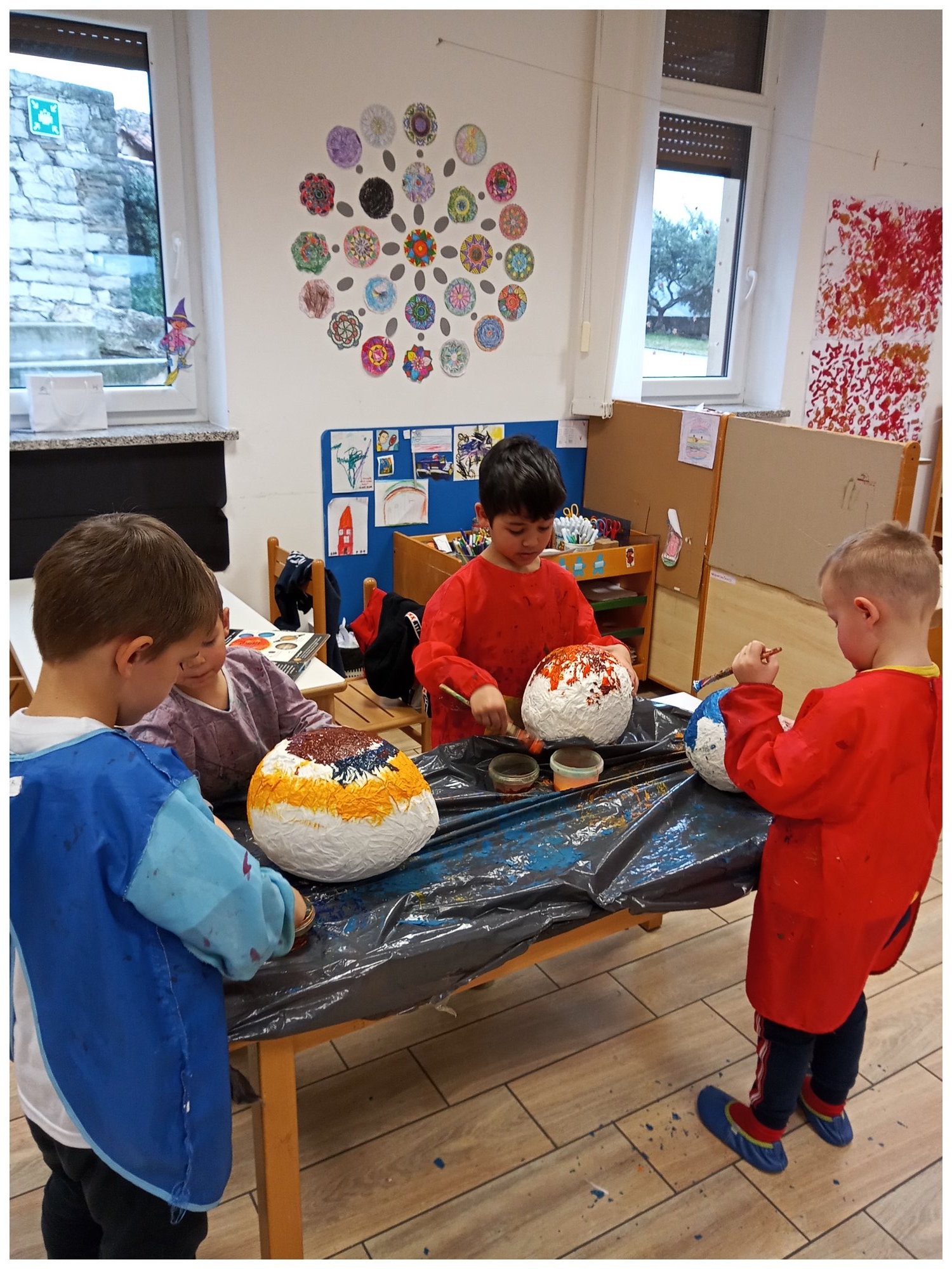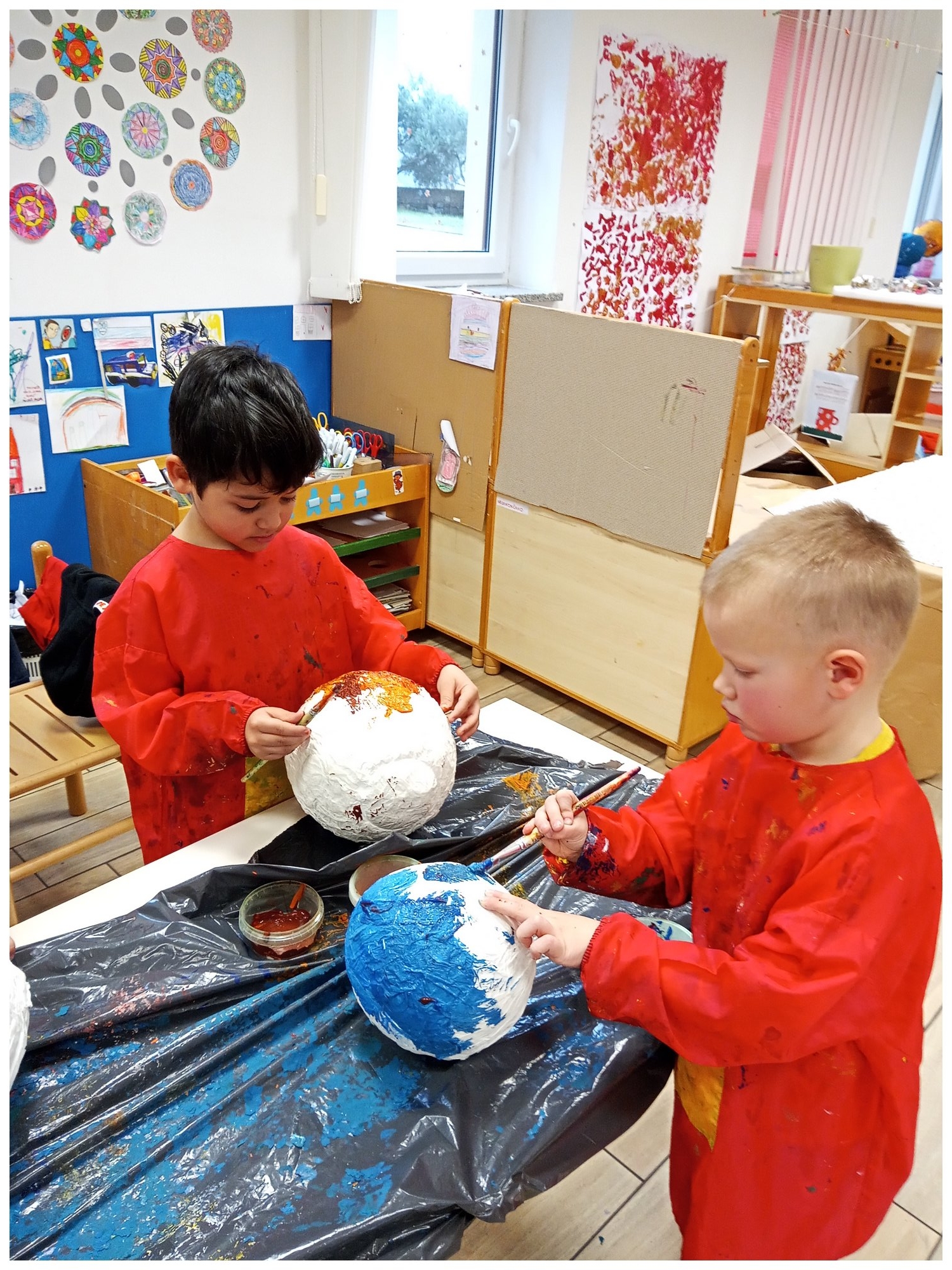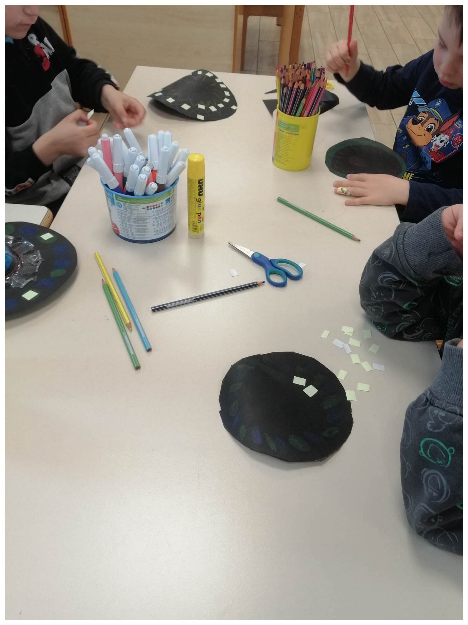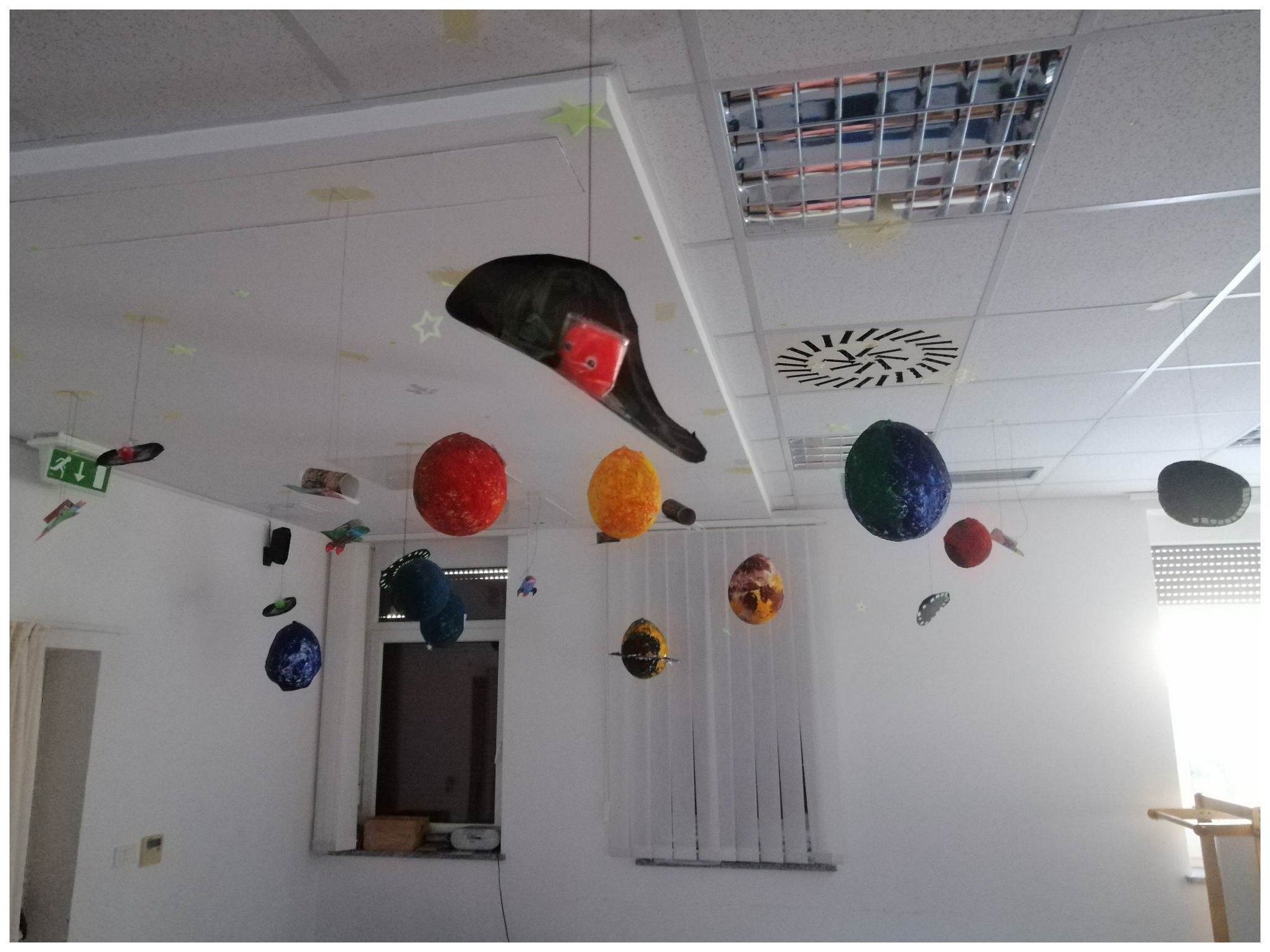 V igralnici pri Zakladih, smo si v kotičku počitka pripravili vesolje. Najprej smo pripravili planete in sonce, nato dodali rakete, leteče krožnike in svetleče zvezde.