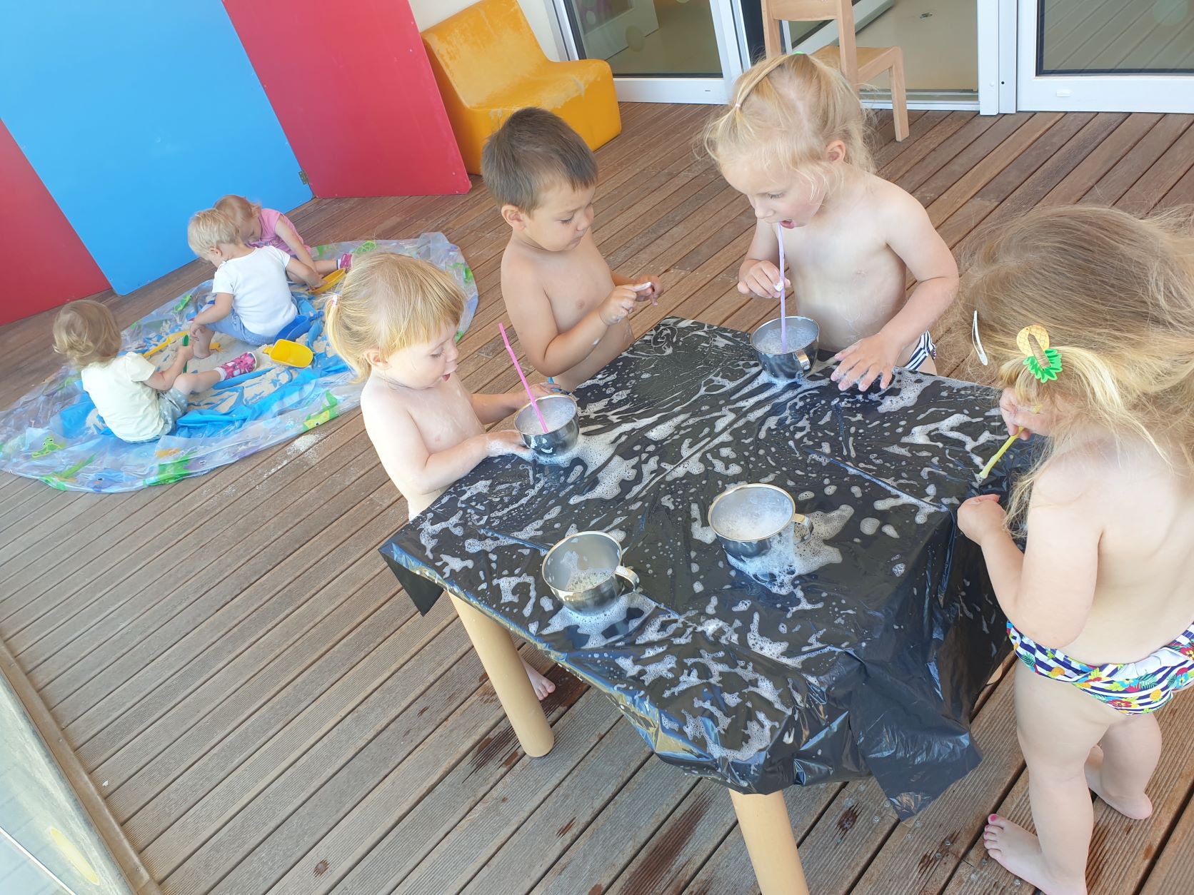 Otroci so vodo v koritih na terasi, prelivali, polnili, praznili različne posode, uporabljali mlinčke, lijake in cedila. Pridobivali so nove izkušnje o lastnostih vode, spoznavali kaj potone in kaj plava, kam izgine luža, ko posije sonce, zakaj jo potrebujejo rastline. Vodo so uporabili za slikanje in pihanje milnih mehurčkov.