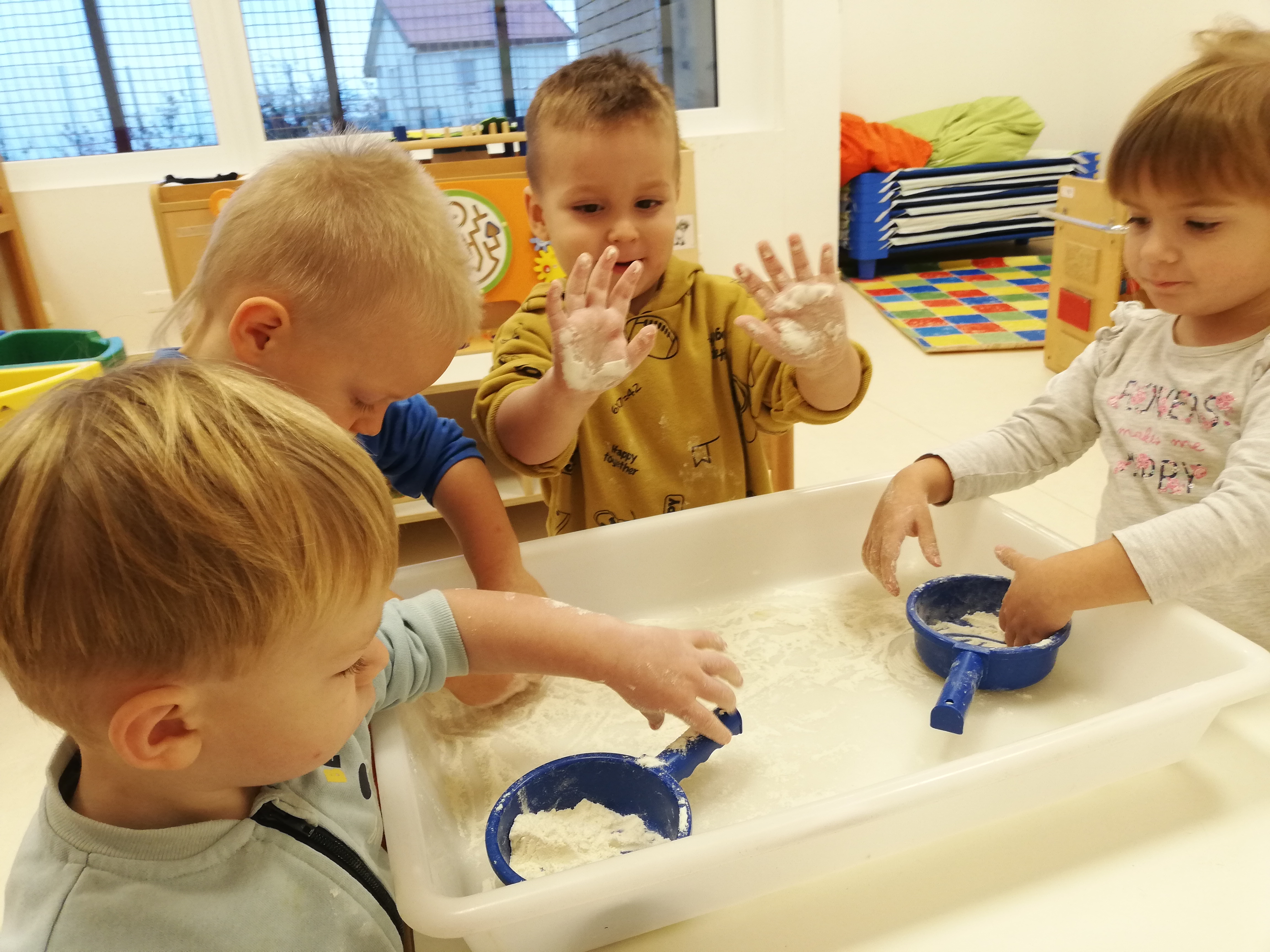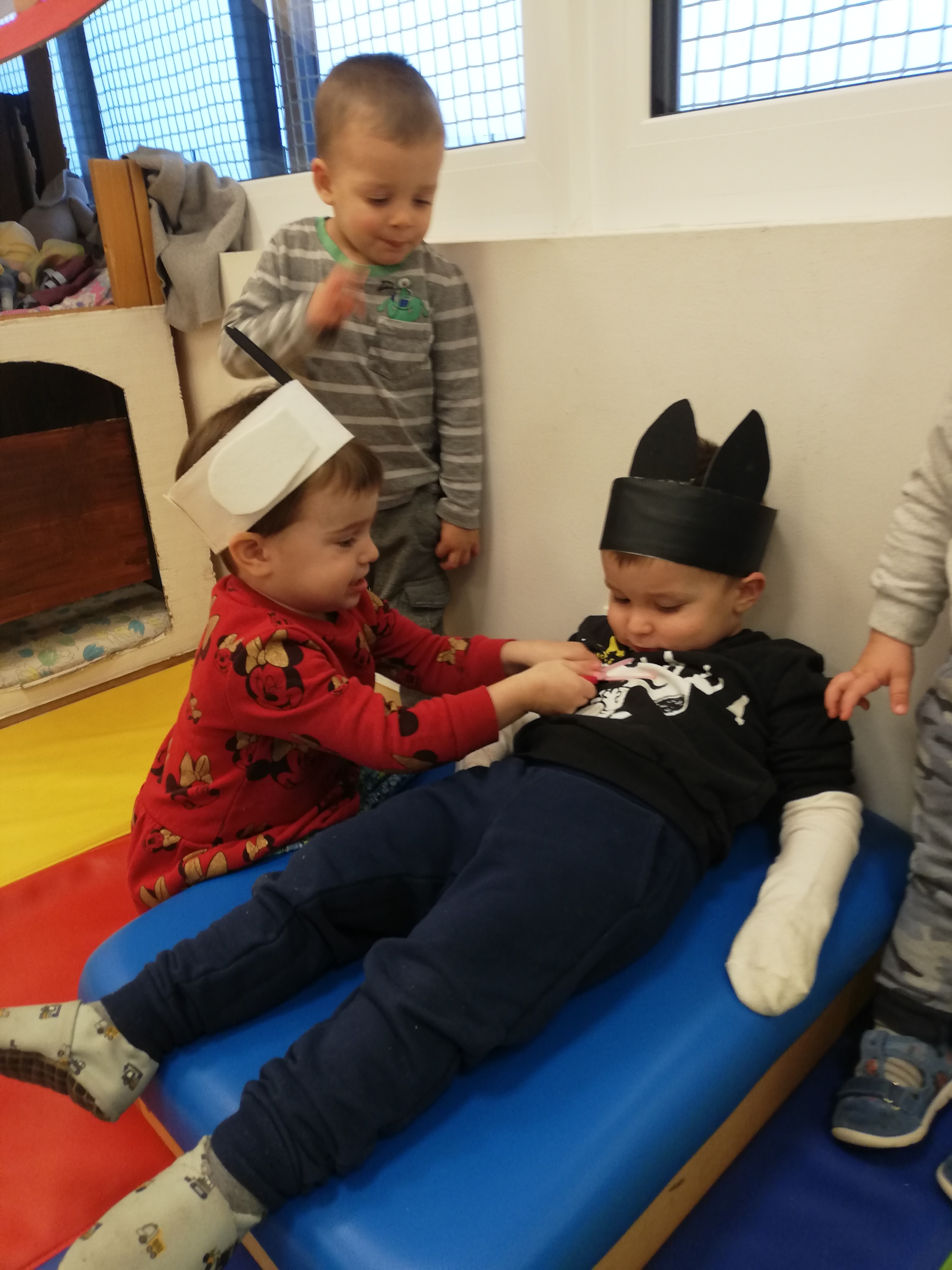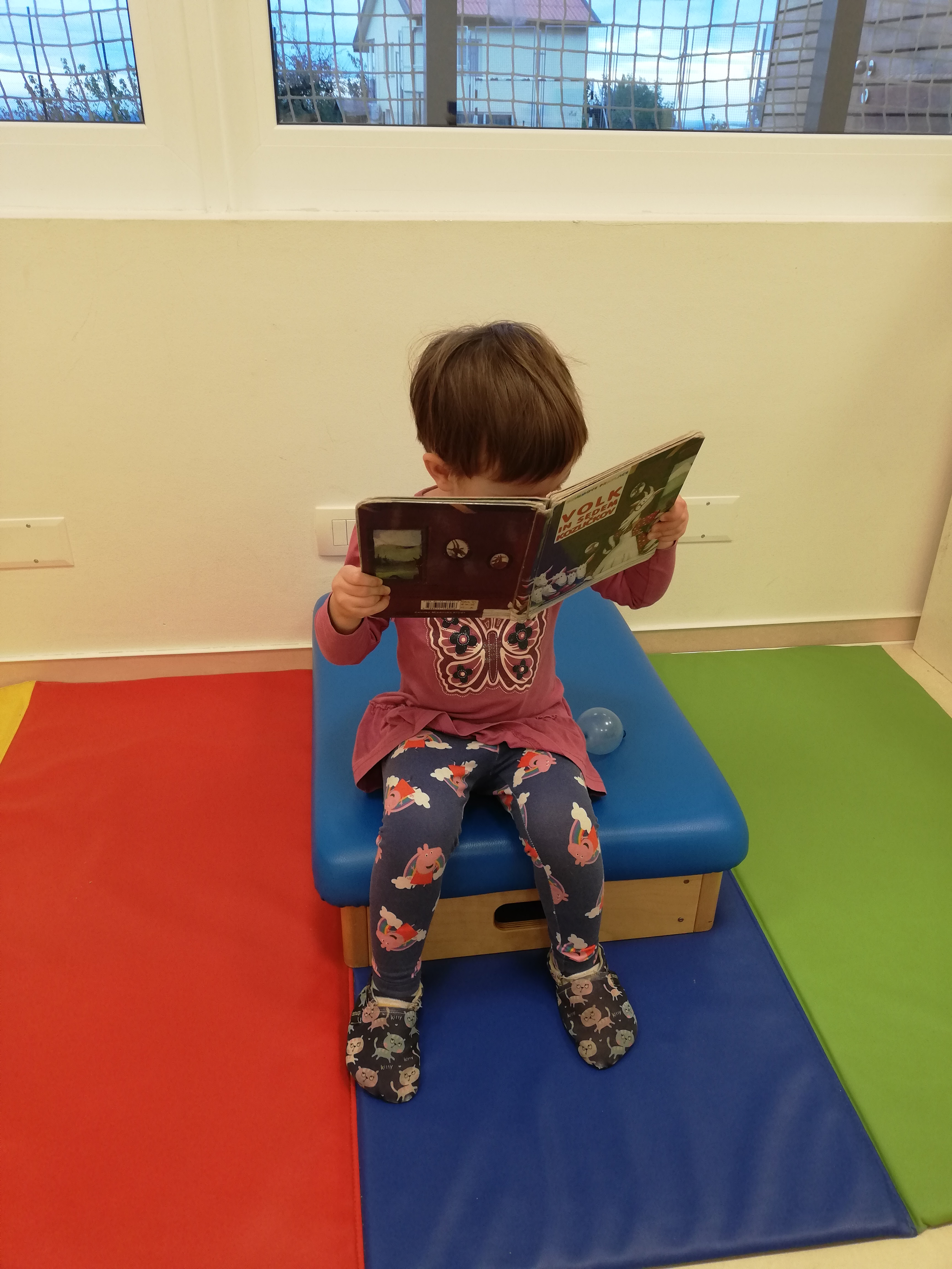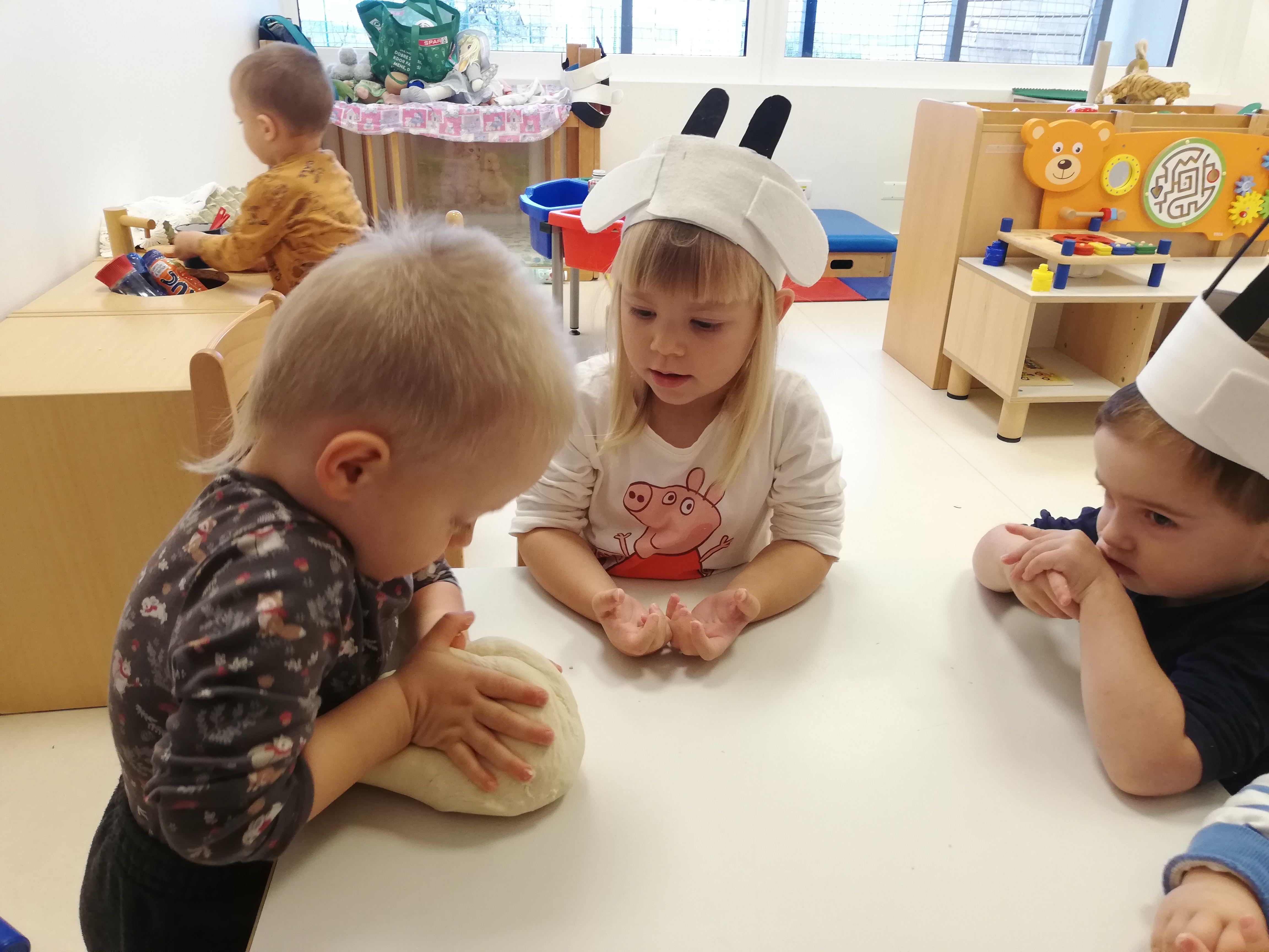 V skupni Želvice se veliko časa zadržujemo v knjižnem kotičku, kjer si ogledujemo različne slikanice in poslušamo krajše zgodbice. Na naši polici se je med drugimi znašla tudi Grimmova pravljica Volk in sedem kozličkov.  Otroci so vsakodnevno posegali po slikanici. Skupaj smo si ogledovali ilustarcije, poimenovali junake in postopoma spoznavali njeno vsebino. Preko pravljice so otroci spoznali številne nove besede. Pravljica je otroke zelo pritegnila, a hkrati v njih vzbujala tudi strah, ki pa so ga postopoma premagali. Vsakič ko, smo šli na sprehod do Sv. Križa smo se ustavili ob vodnjaku, potrkali in poslušali, če bomo morabiti slišali volka, ki je pod težo težkih kamnov padel v vodnjak. Izdelali smo si naglavne rekvizite in uprizarjali zgodbo. Igrali smo se z moko in opazovali kako naše roke postajajo bele, prav tako kot volkove tace, ko jih je mlinar potresel z moko. Zamesili smo tudi  kvašeno testo in si ga tako kot volk ovijali okrog roke.   S pravljico smo se ukvarjali cela dva meseca in kot kaže se je še vedno  nismo naveličali.