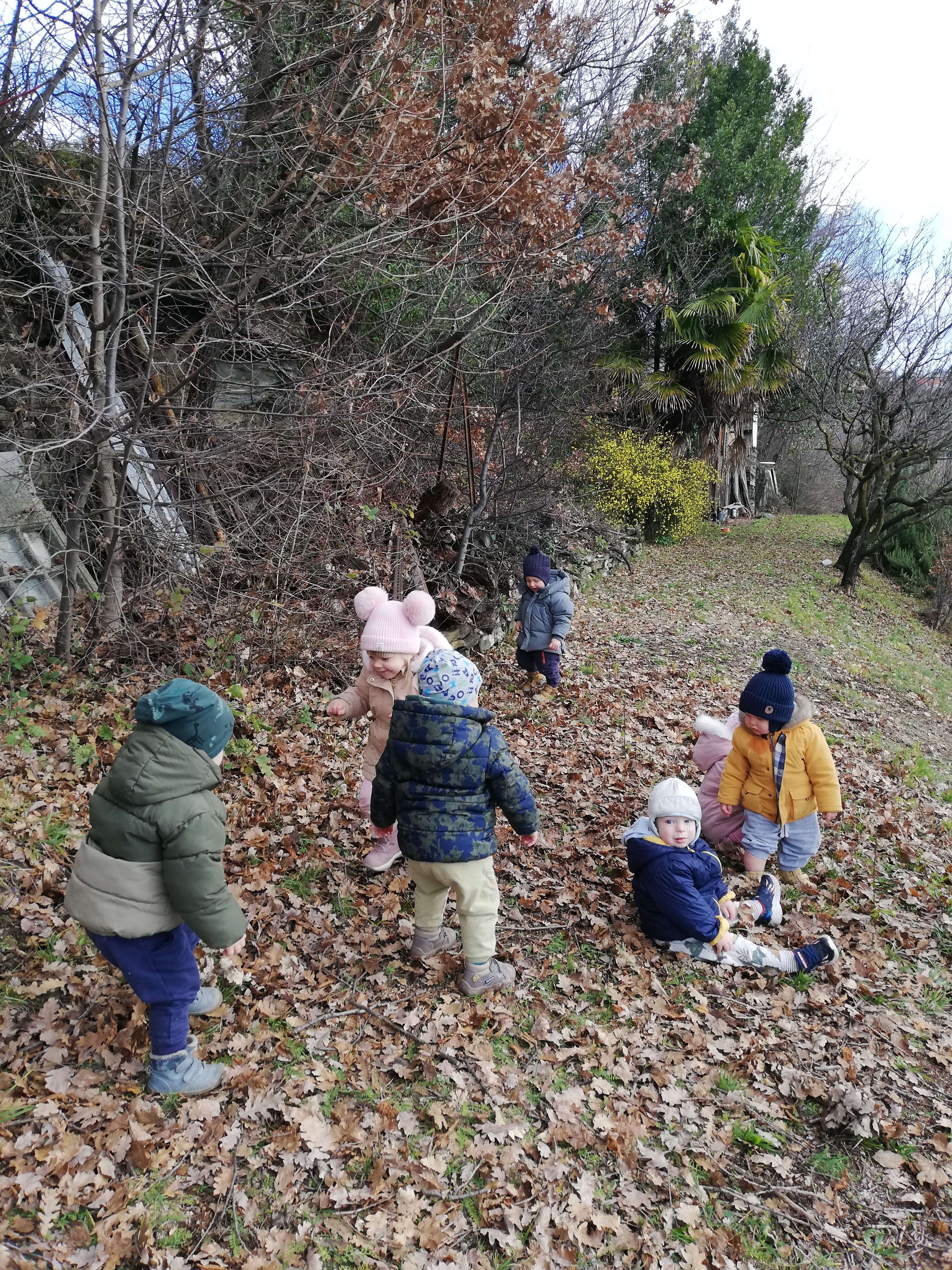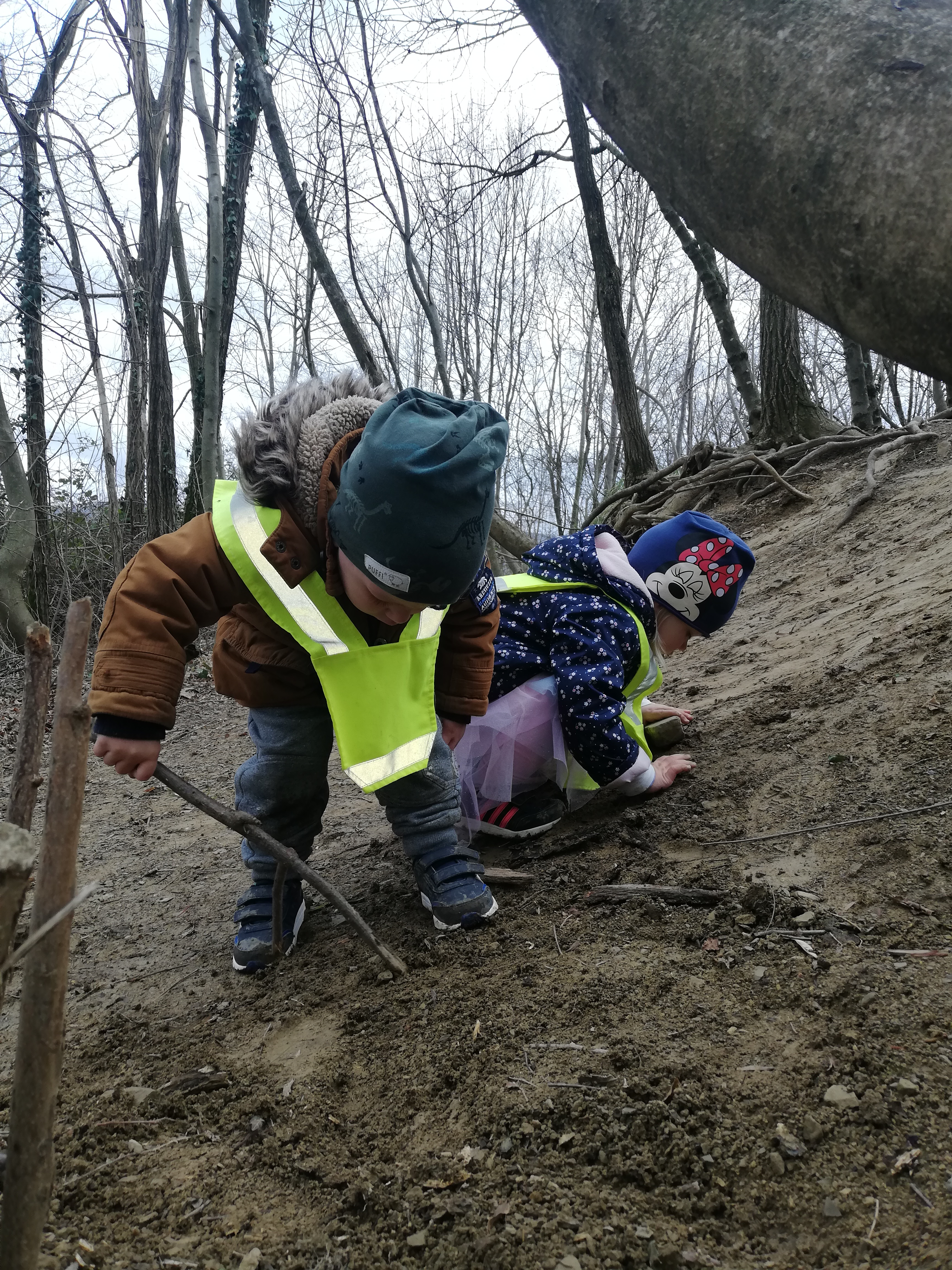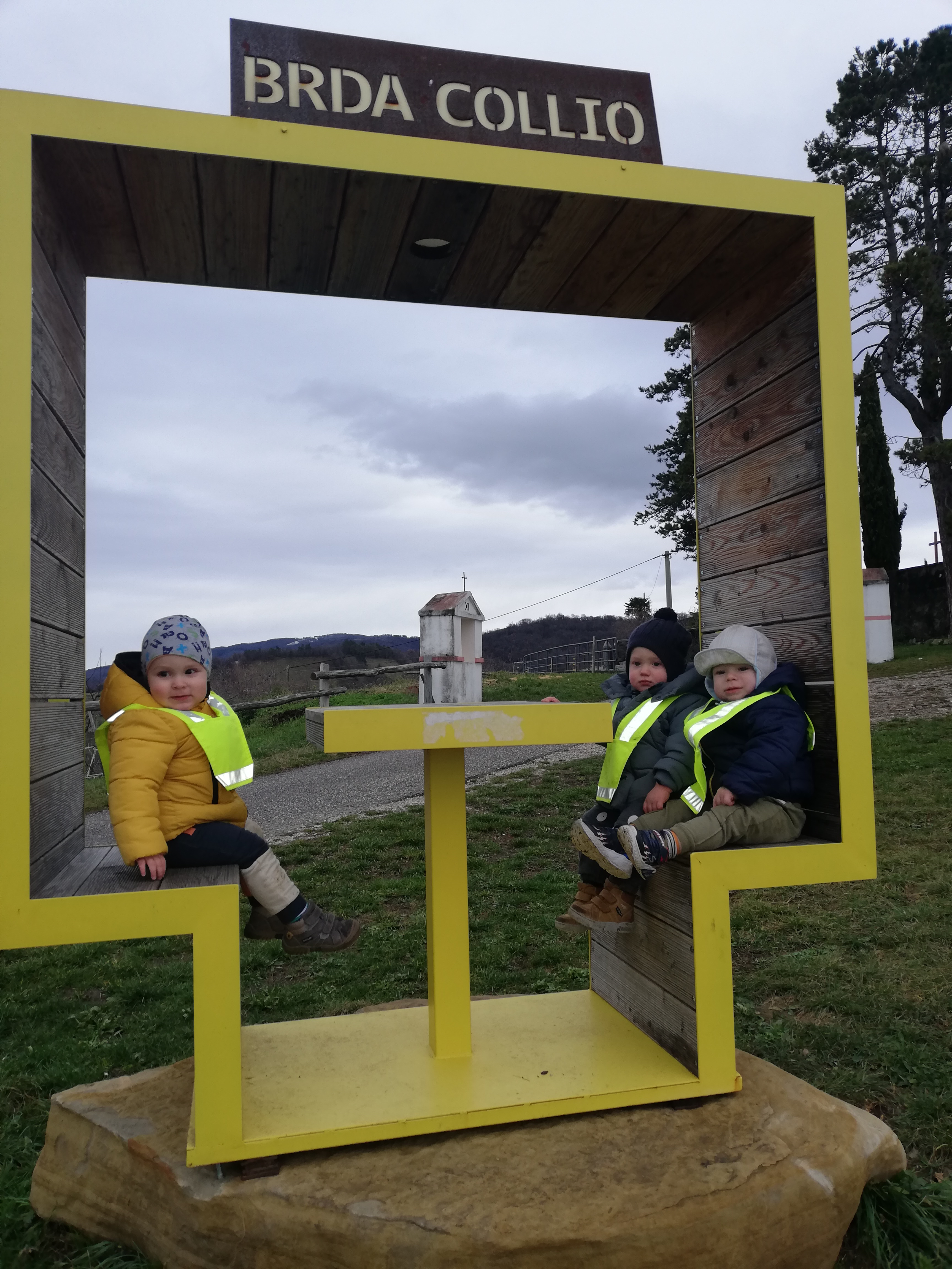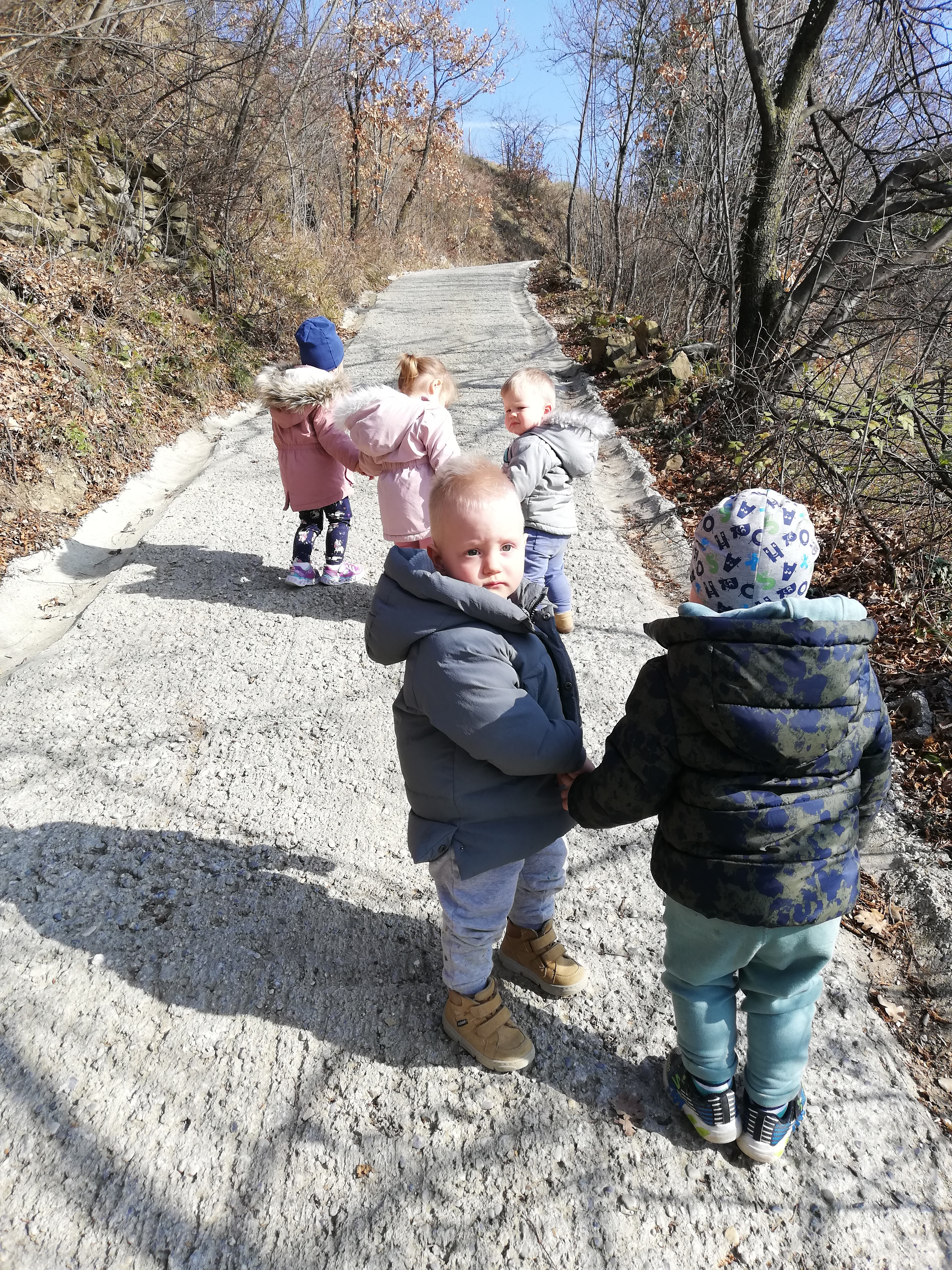 Čeprav smo v vrtcu najmlajši, saj večina še ni dopolnila dveh let, se radi odparvimo na sprehod. Naši sprehodi so bili sprva zelo kratki, le do bližnjega parkirišča, nato pa so se postopoma daljšali. Tako se sedaj že zmoremo povzpeti na sv. Križ. Po poti našo pozornost pritegnejo različna vozila, z zanimanjem prisluhnemo različnim zvokom, najraje pa se ustavimo ob ograji, kjer opazujemo in poslušamo kokoši, peteline, race in gosi. Najvčkrat pa se sprehodimo do bližnjega sadovnjaka, kjer plazamo po terasah, tragamo rože, kopljemo po zemlji, opazujemo ptice in poslušamo njihovo petje ter vsakič znova odkrijemo kaj novega. Z vsakim sprehodom postajamo vse bolj spretni in vzdržljivi.
