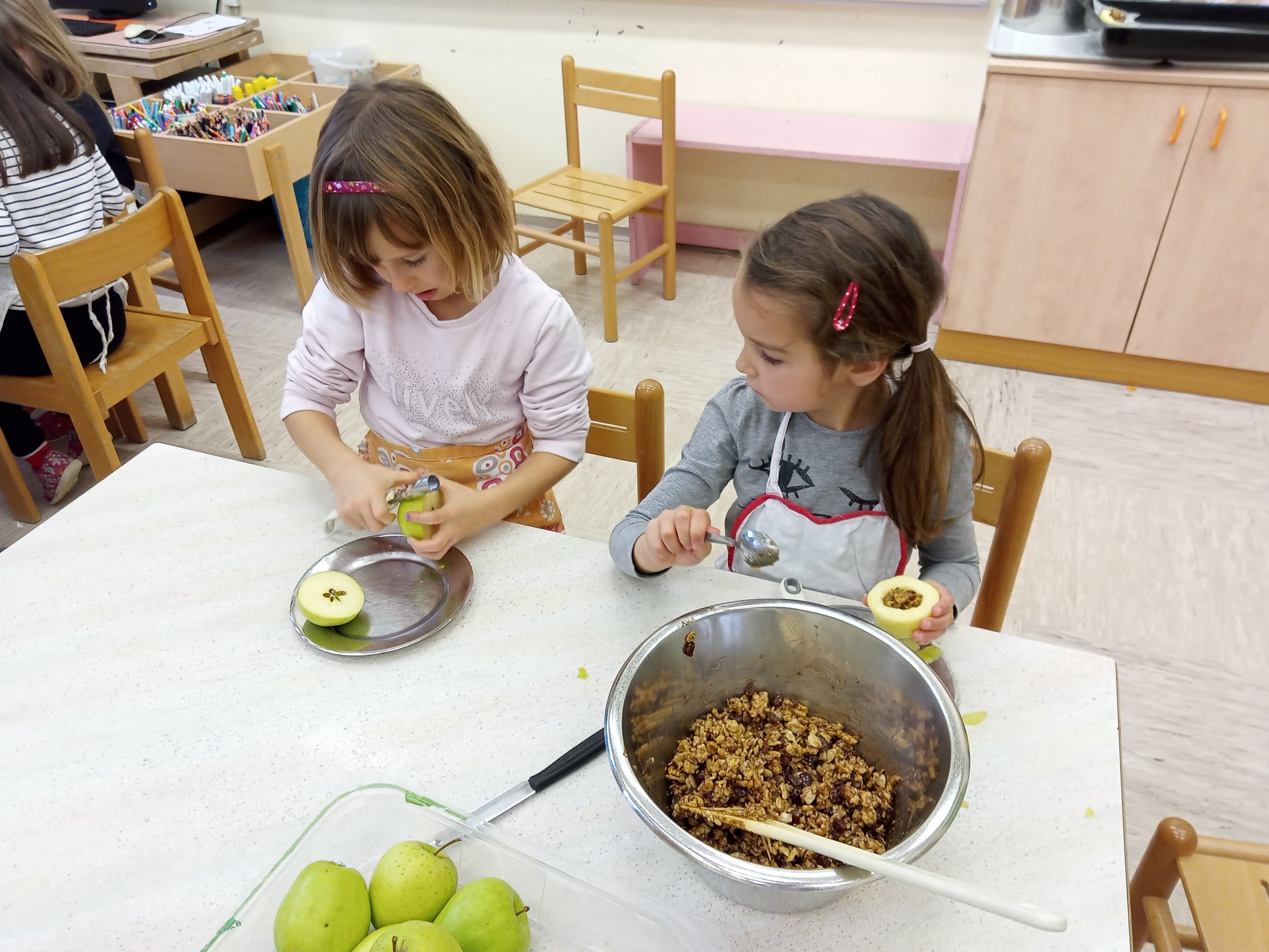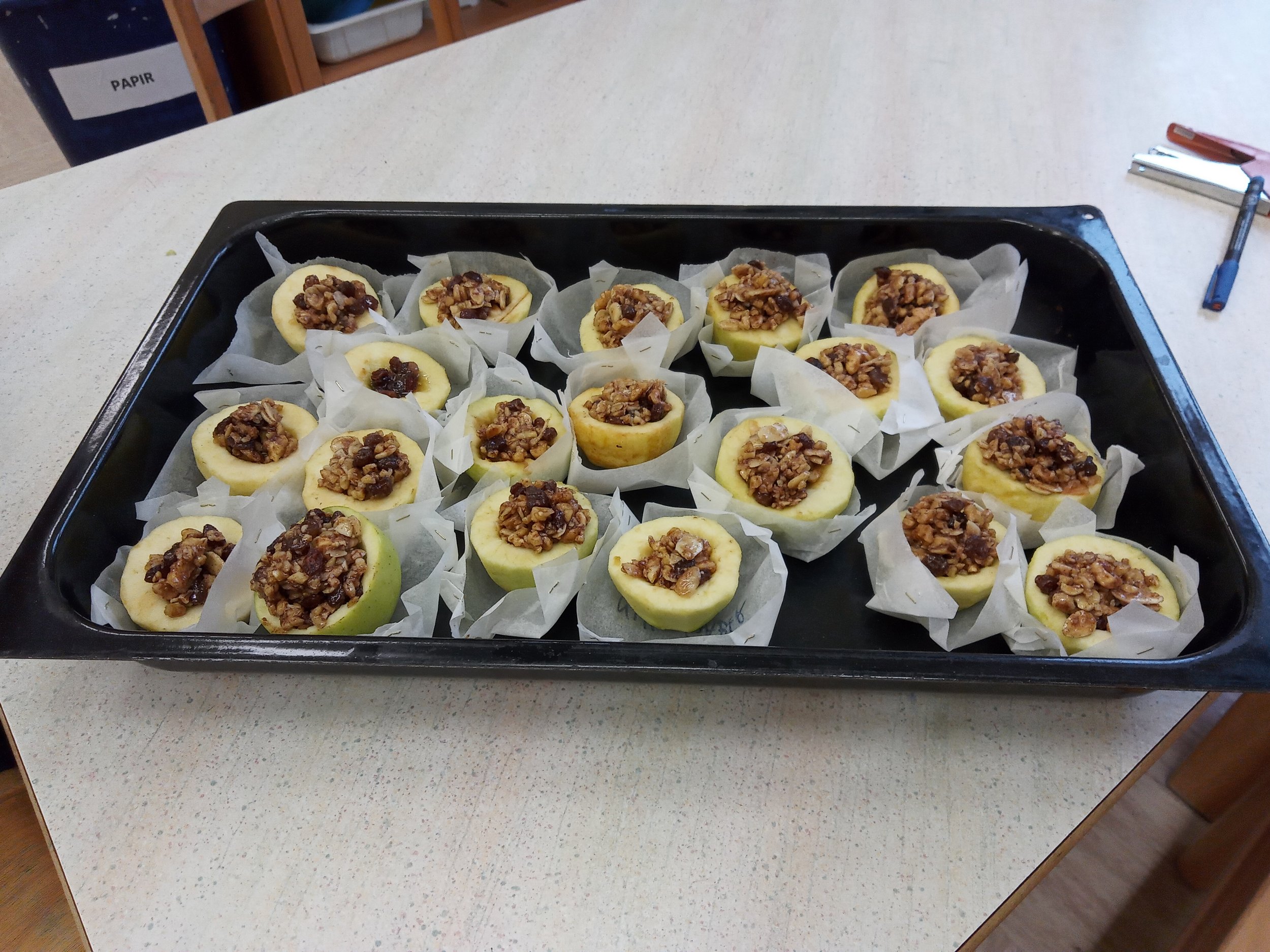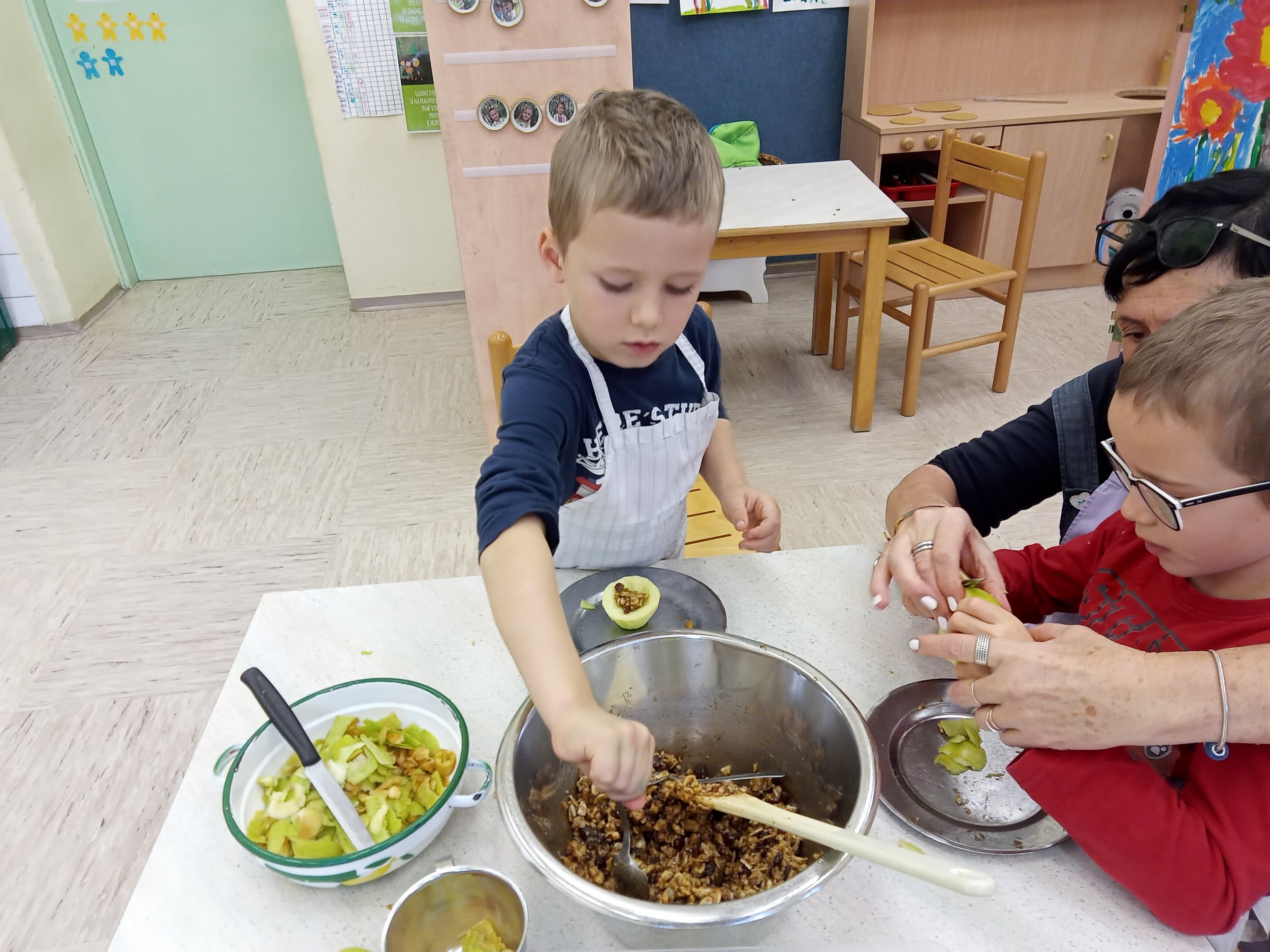 V posodi zmešamo orehe, mandlje, rozine, cimet in med. Jabolkam odrežemo pokrov, jih olupimo in izdolbemo. Napolnimo jih z nadevom, postavimo v pekač na peki papir in pečemo na 180 °C, 25 minut.