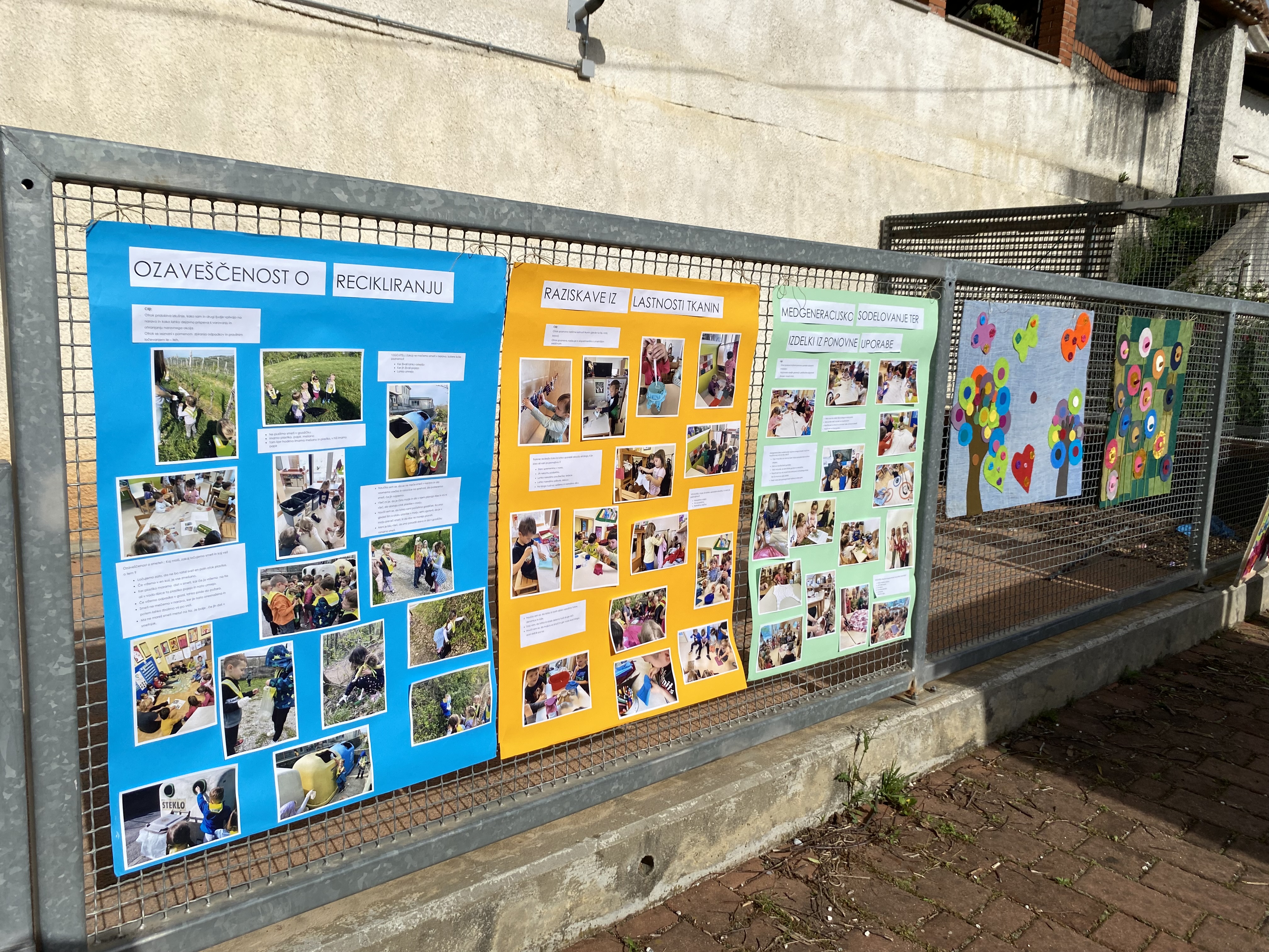 naredimo s tistim kosom, ki je še vedno lep, vendar nam premajhen. Izvedli smo različne poizkuse iz le-tega. Vsaka igralnica je uporabila metodo ponovne uporabe oblačil, pri katerem so nastajali čudoviti izdelki otrok s pomočjo strokovnih delavcev. Zaključek projekta smo izvedli na igrišču v Riu, kjer so nastopali otroci iz skupine Lisice, Zajčki ter Volki. Sledila je razstava otrokovih izdelkov, plakati s fotografijami dejavnosti ter stojnice, kjer si je lahko vsak izmed staršev izbral kos oblačila za svojega otroka.