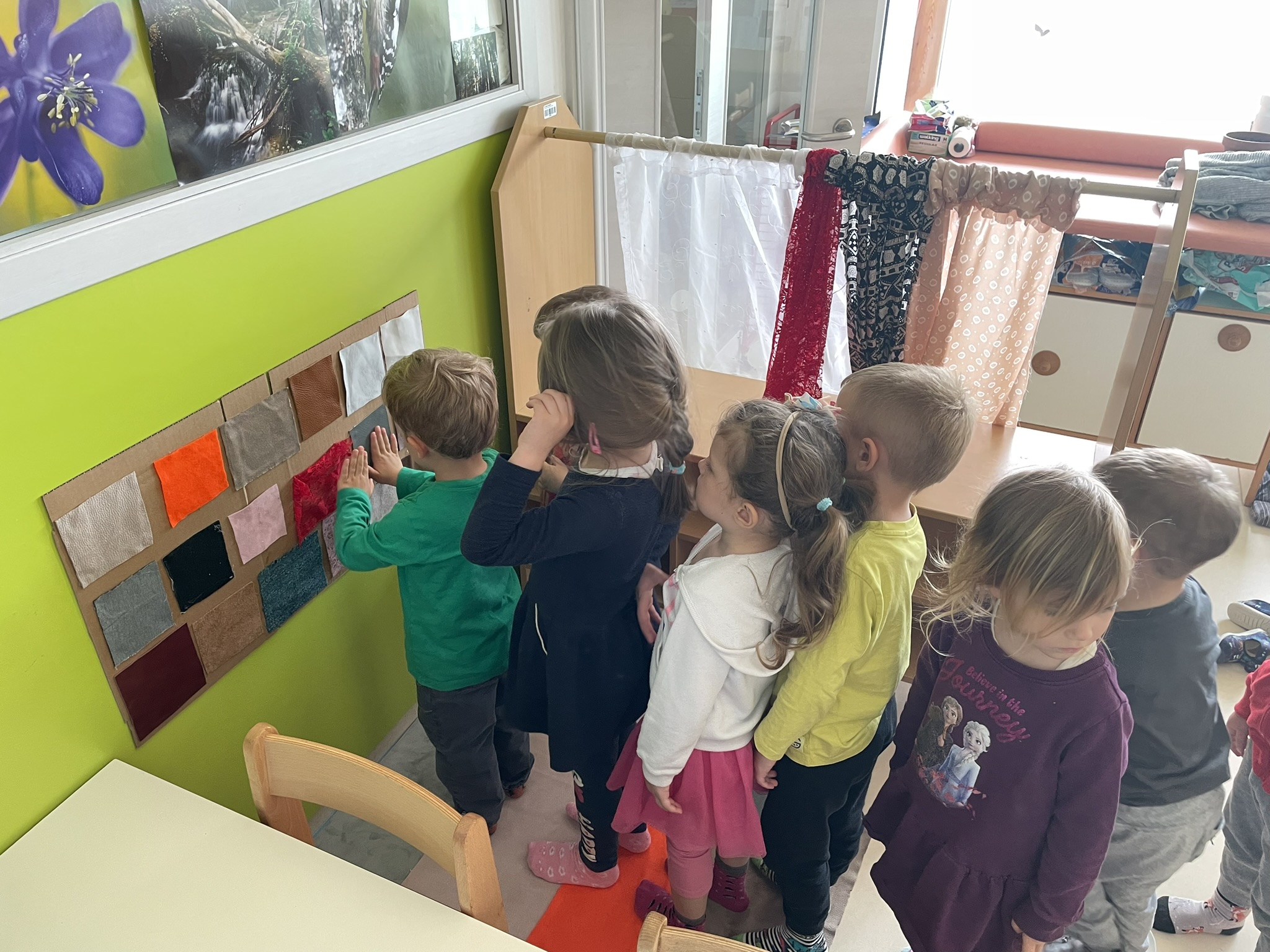 Nato smo začeli spoznavati različne vrste tkanin glede na vonj, tip, barvo, vzorce. Pogovarjali smo se o tem, kaj naredimo z raztrganim kosom oblačila, kaj pa