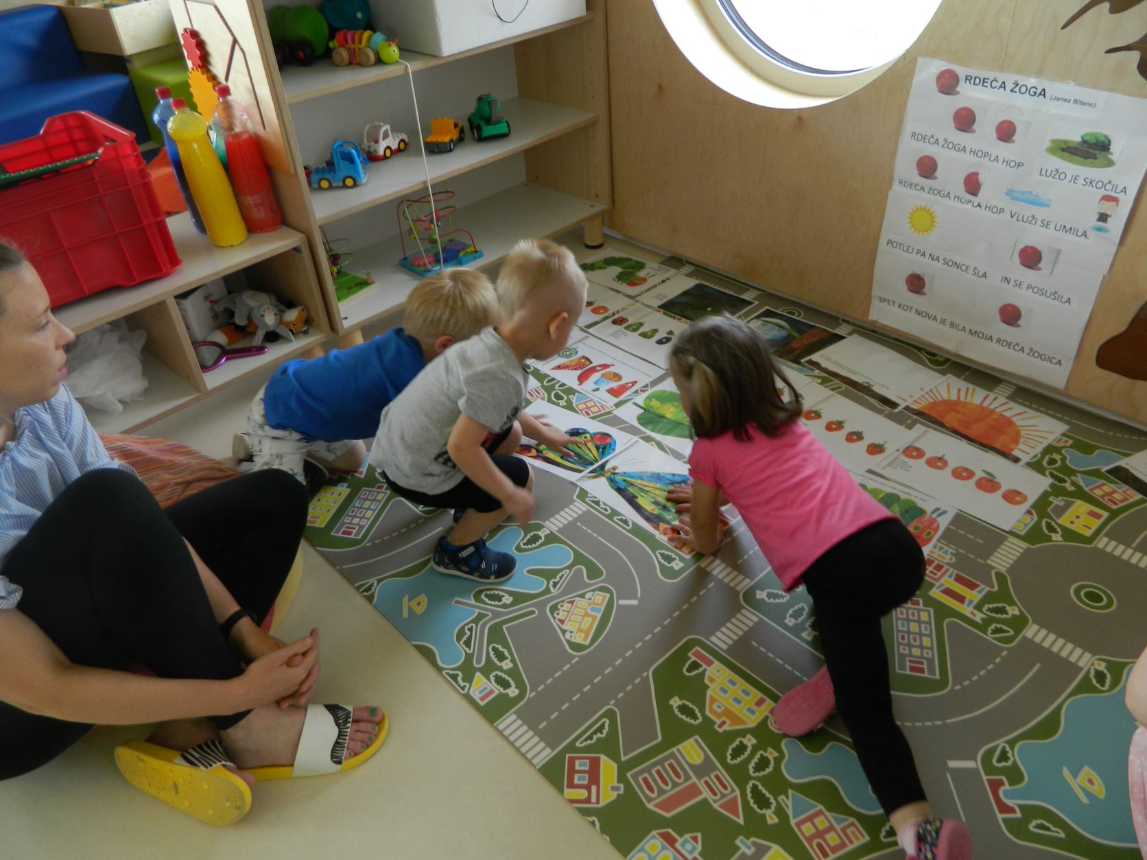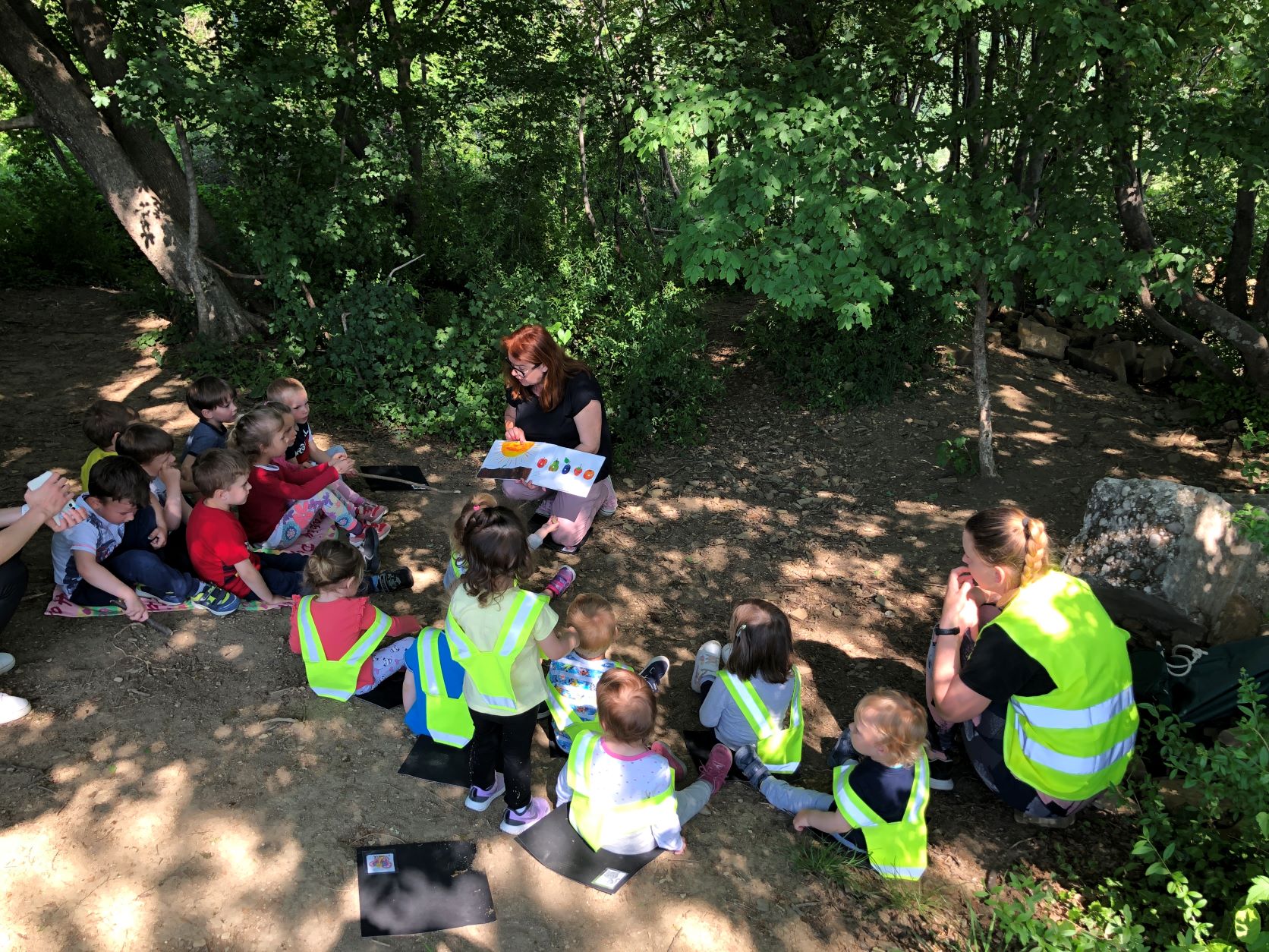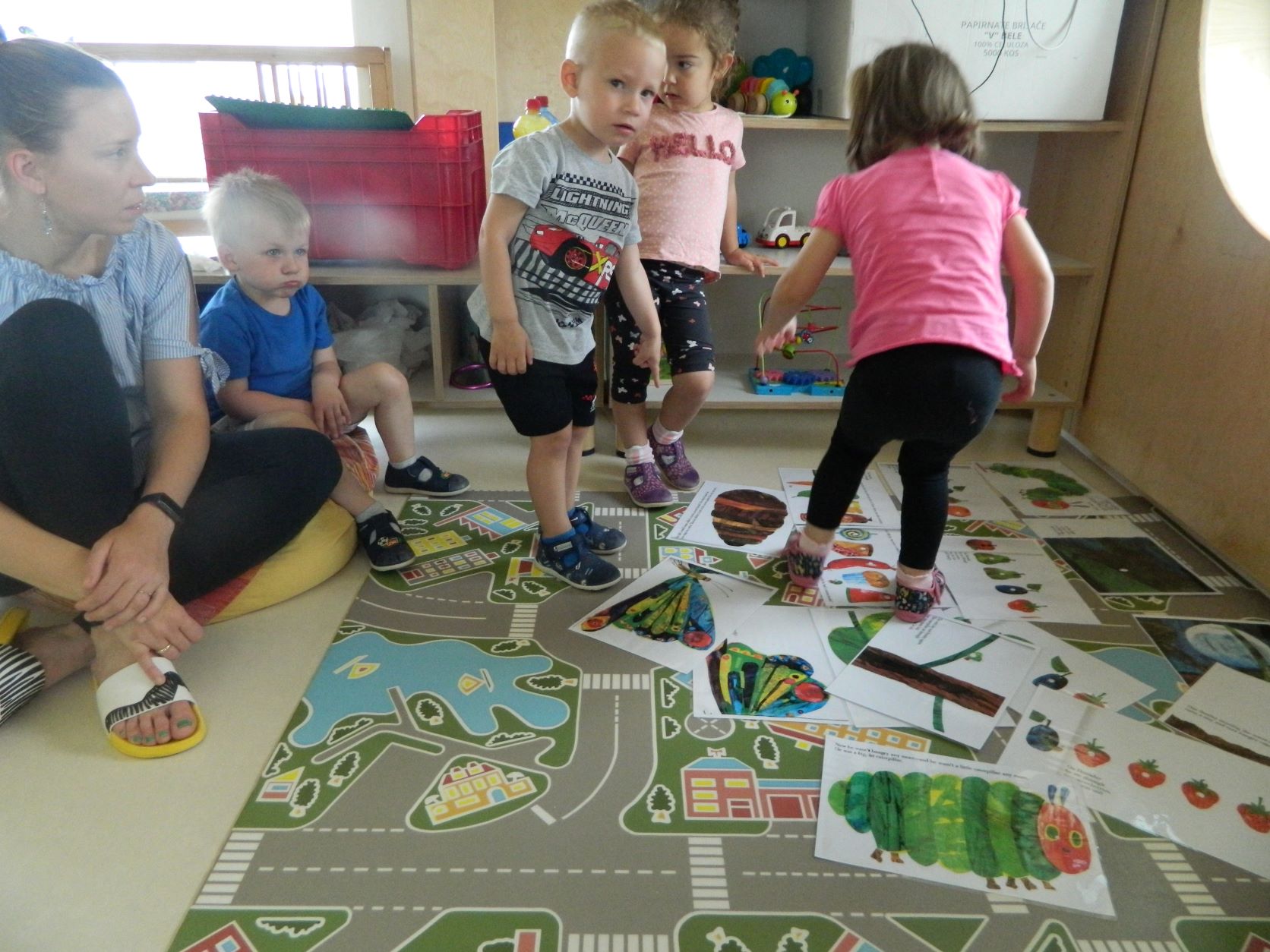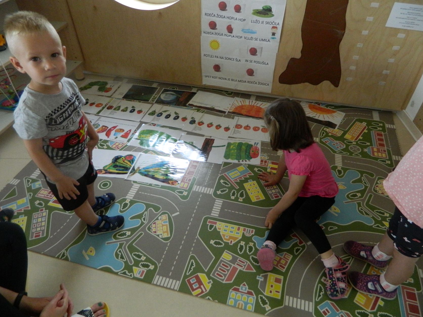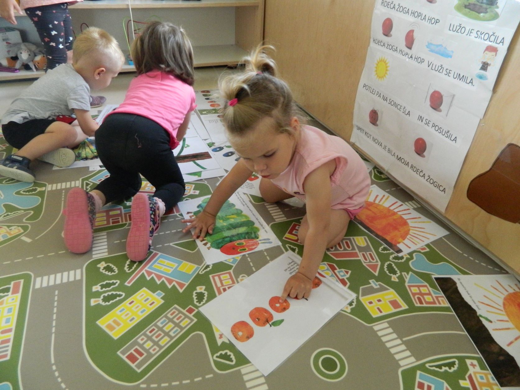V skupini Žogoce smo se seznanili z knjigo "Zelo lačna gosenica" (Eric Carle). Knjigo smo prebirali tudi v gozdičku.