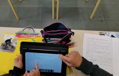 Pri pouku smo uporabljali tablice. Ogledali smo si posnetke preteklih dirk, iskali podatke o zgodovini gira, o prvi dirki, roza majici ter o uspehu Slovenskih kolesarjev na dirki. Na koncu smo naredili plakate, prilepi še slike in sestavili tudi slovensko italijanski slovar. Plakati krasijo pano na glavnem vhodu v šolo.